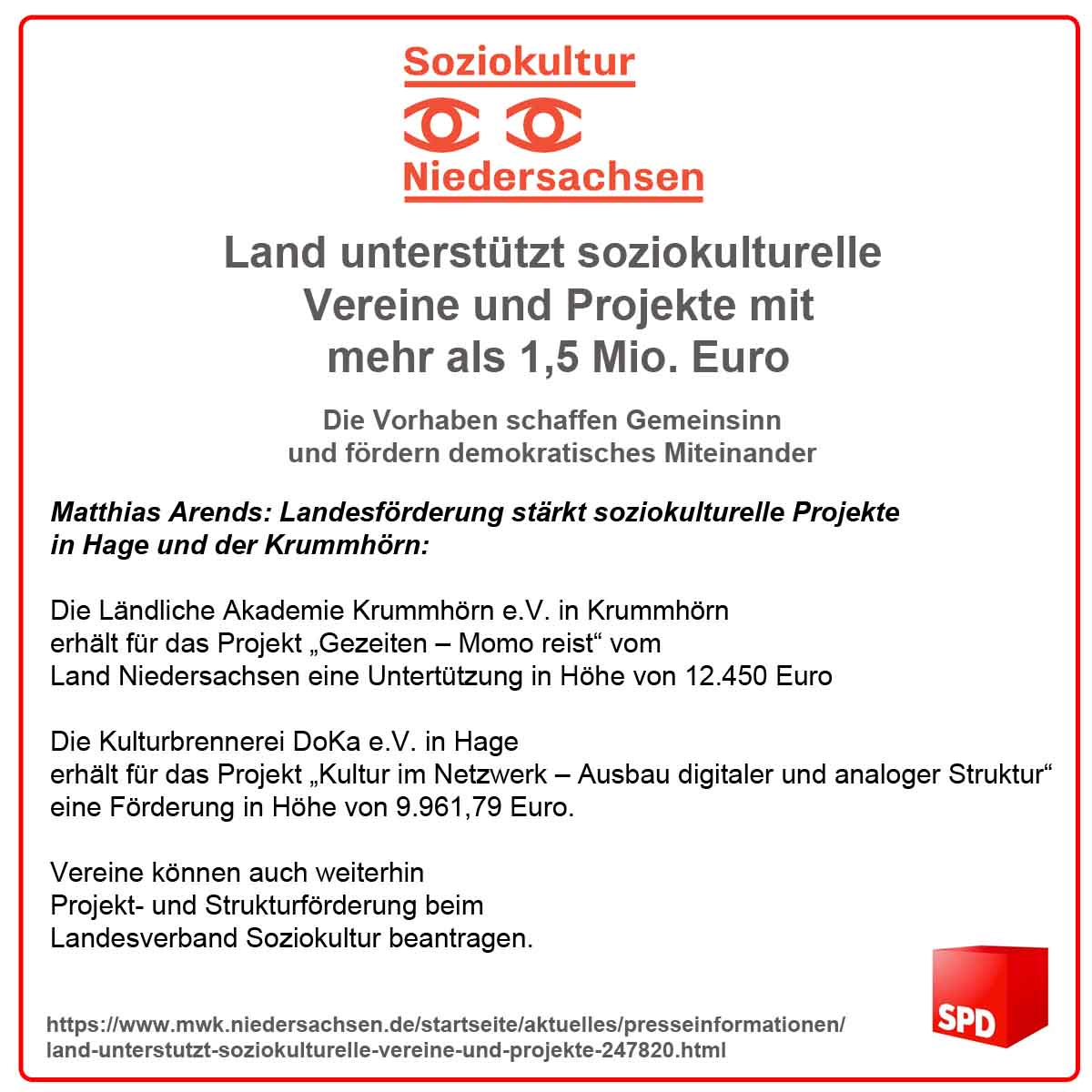 Die rot-grüne Landesregierung unterstützt im ersten Halbjahr 2026 soziokulturelle Vereine und Projekte in Niedersachsen mit insgesamt rund 1,5 Millionen Euro. Besonders freut sich der SPD-Landtagsabgeordnete Matthias Arends über die Förderzusagen für zwei Projekte in der Region.